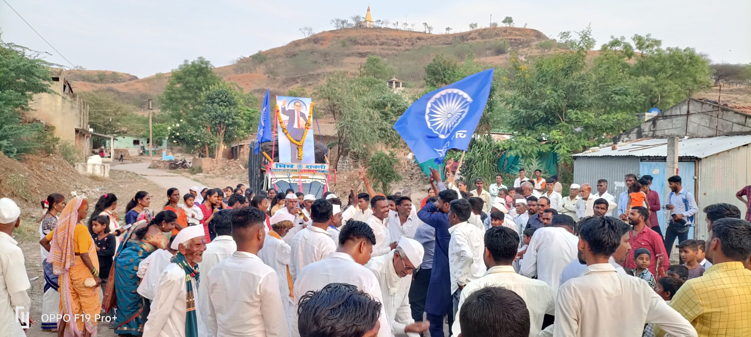 यावेळी मिरवणुकीत फटाक्यांच्या आतिषबाजीने व बाबासाहेबांच्या नावाच्या घोषणांनी गाव दुमदुमून गेले होते