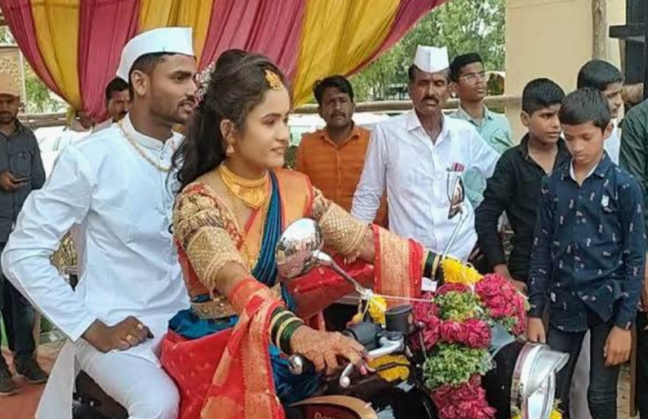मुलीने बुलेटवर नवऱ्याला पाठीमागे बसवून लग्न मंडपात ग्रँड एंट्री केली