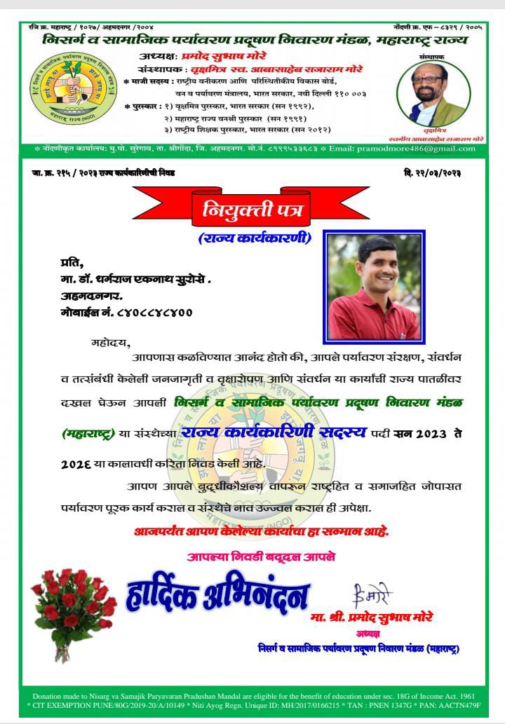 पर्यावरण प्रदूषण निवारण मंडळाचे राज्य अध्यक्ष प्रमोदजी मोरे साहेब यांनी डॉ. धर्मराज सुरोशे यांची निवड 2023 ते 2026 या कालावधीसाठी केली आहे. या निवडीबद्दल मा.नामदार राधाकृष्ण विखे पाटील
