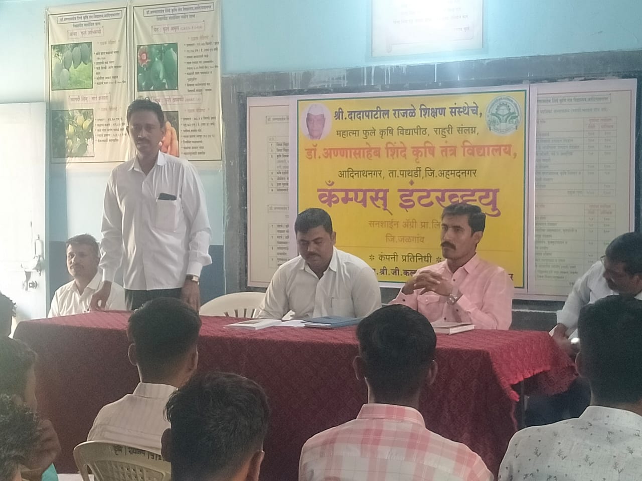 डॉ. अण्णासाहेब शिंदे कृषी तंत्र विद्यालय , आदिनाथनगर येथे सनशाइन ॲग्री प्रा . लि. जळगाव या कंपनीचा कॅम्पस इंटरव्यू आयोजित करण्यात आला होता त्याप्रसंगी ते बोलत होते .