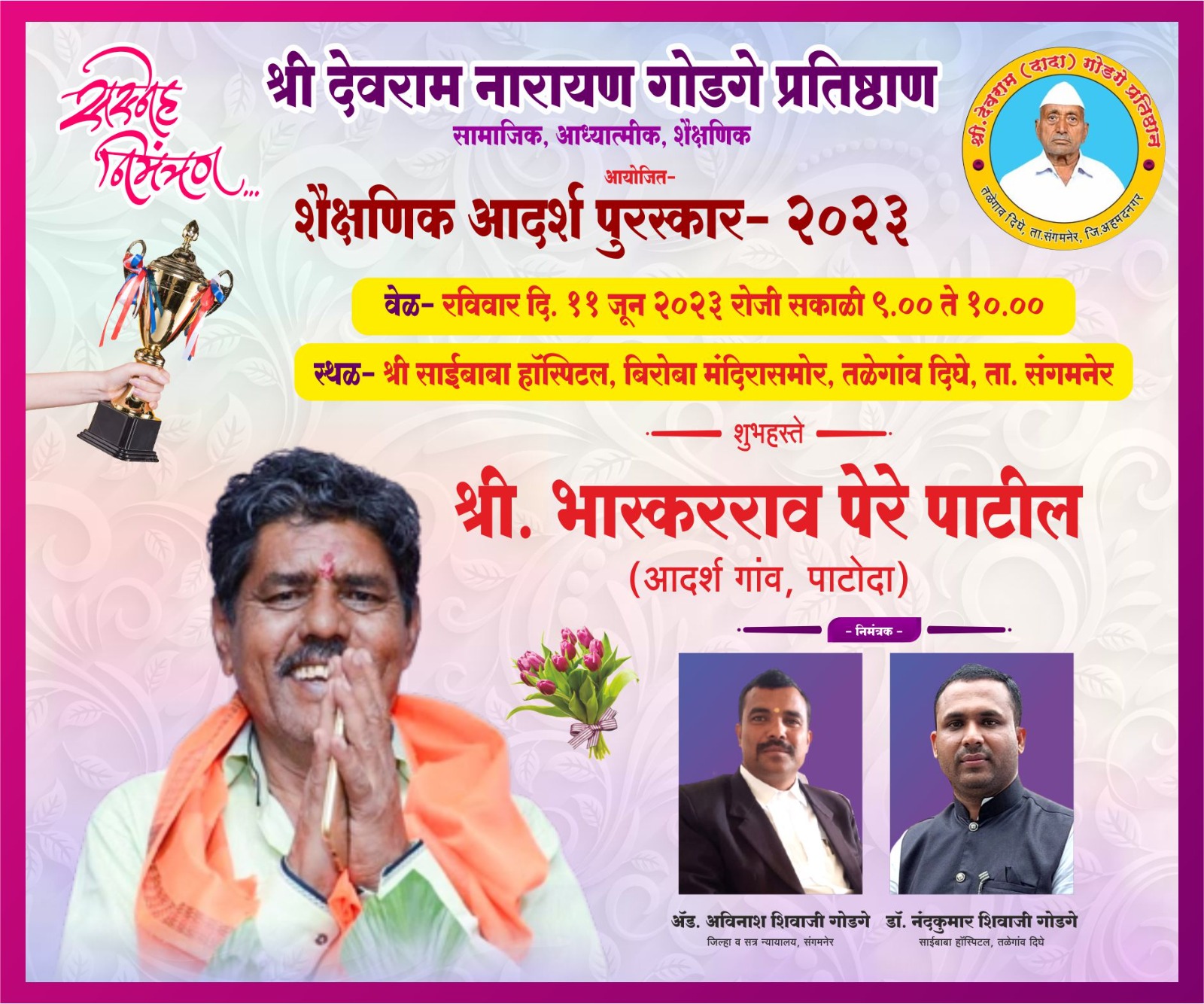 आदर्श गाव पाटोदा येथील श्री भास्करराव पेरे पाटील यांच्या हस्ते तसेच इतर मान्यवरांच्या हस्ते या पुरस्कार सोहळ्याचं वितरण होणार आहे. विद्यार्थ्यांना फेटा, प्रमाणपत्र स्मृतीचिन्ह, गुलाब पुष्प देऊन सन्मानित करण्यात येणार आहे प्रतिष्ठानचे हे 2 रे वर्ष आहे .श्री भास्करराव पेरे यांचे विचार ऐकण्यासाठी आपण सर्वांनी आवर्जून उपस्थित रहावे असे आवाहन प्रतिष्ठानचे अध्यक्ष एडवोकेट श्री अविनाश शिवाजी गोडगे व डॉ नंदकुमार गोडगे यांनी केलेले आहे