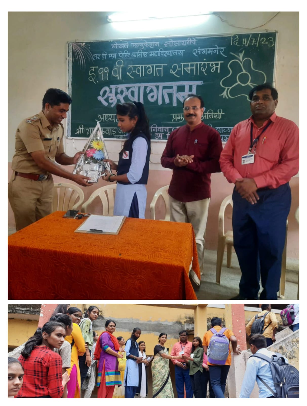 शहरातील गोखले एज्युकेशन सोसायटीच्या सर डी एम पेटिट विद्यालय व जुनिअर कॉलेजमध्ये प्र. प्राचार्या डॉ. अस्मिता देशपांडे यांच्या मार्गदर्शनाखाली ११ वी कला , वाणिज्य व विज्ञान शाखेतील विद्यार्थ्यांचे संगमनेर शहर पोलीस स्टेशनचे पोलीस उपनिरीक्षक निवांत जाधव व बाळासाहेब यादव यांच्या हस्ते गुलाब पुष्प देऊन स्वागत करण्यात आले. प्रारंभी गोखले एज्युकेशन सोसायटीचे सचिव स्वर्गीय डॉ. मो . स . गोसावी यांना श्रद्धांजली वाहण्यात आली.