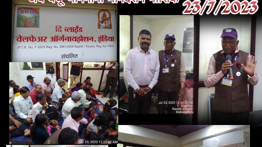 दि ब्लाइंड वेल्फेअर ऑर्गनायझेशन व लायन्स क्लब नाशिक स्टार यांच्या संयुक्त विद्यमाने संस्थेचे कार्यालय शालिमार येथे ठीक 11:00 वाजता मान्यवरांच्या हस्ते 65 व्यक्तींना शालेय साहित्याचे वाटप करण्यात आले. ज्यामध्ये वह्या, रजिस्टर, चित्रकला वही, कंपास, पाणी बॉटल आदींचा समावेश होता. यावेळेस लायन्स क्लब च्या वतीने क्लबच्या अध्यक्षा सौ. अश्विनी बाग, अभय बाग, अध्यापक साहेबराव कांगुणे हे उपस्थित होते. यावेळी श्री बाग यांनी आपल्या मनोगतातून त्यांनी एका विद्यार्थ्यांना शिकत राहावे असे प्रेरणा दायी विचार व्यक्त केले. तर अध्यक्षा लायन अश्विनी बाग यांनी देखील आपण हा कार्यक्रम बघून भारावून गेलो व भविष्यात या संस्थेला भरीव मदत करू अशी ग्वाही दिली. ( युवा क्रांती फाउंडेशन, पोलीस मित्र ) श्री कागुणे सर व श्री निलेश शेकोकार ( लोकवेध लाईव्ह न्यूज, न्यूजशोधांश न्यूज, युवा क्रांती फाउंडेशन पोलीस मित्र ) नाशिक यांनी देखील संस्थेचे कार्य मला मागील 15 वर्षापासून माहीत असून ज्या ज्या वेळेस संस्थेला माझी गरज वाटेल त्यावेळेस त्यांनी मला आवश्यक आवाज द्यावा अवश्य अडचण सांगावी, मला जे शक्य असेल ती मदत मी करेल अशी ग्वाही दिली.