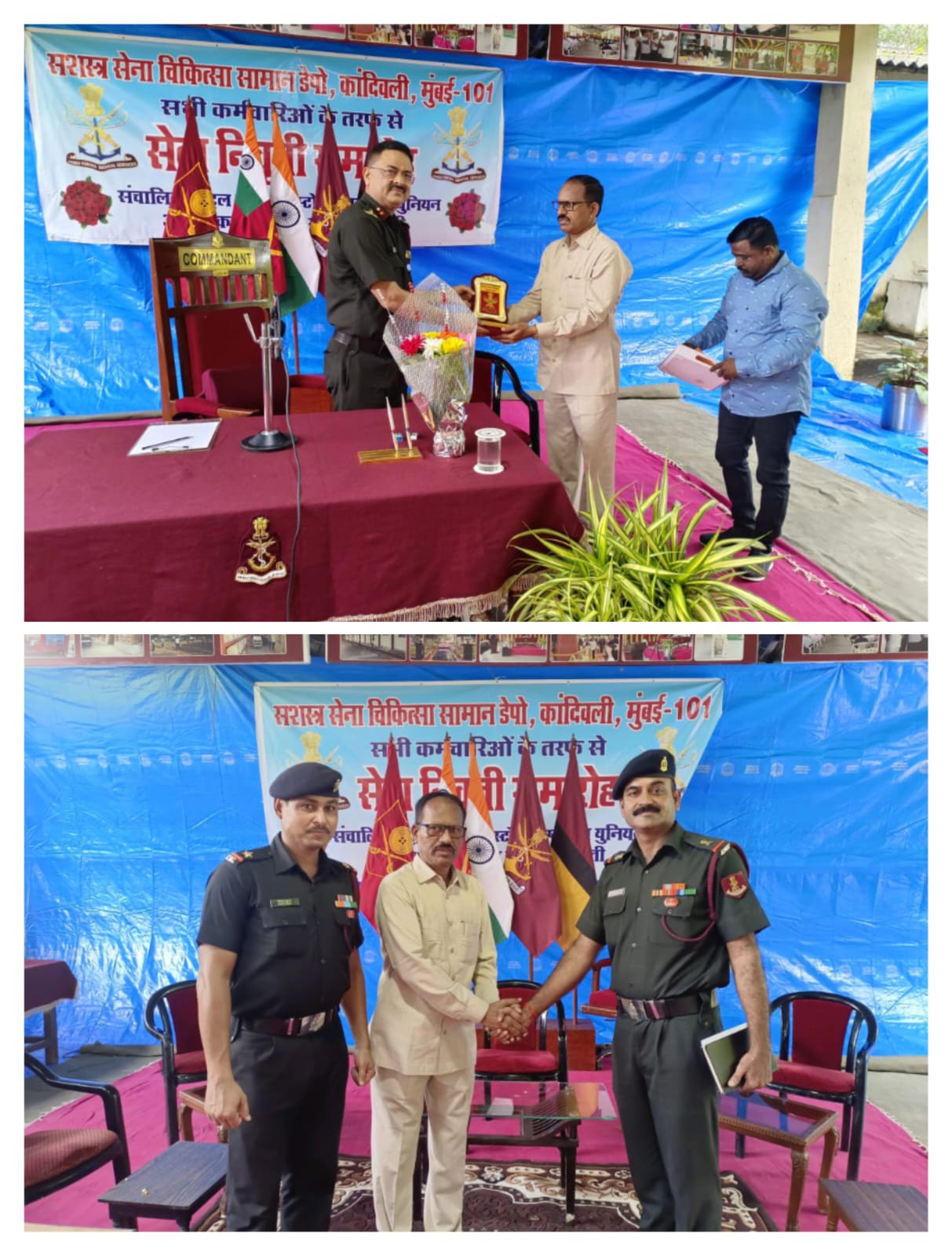 नाशिक जिल्ह्याचे भुमिपुत्र व सशस्त्र सेना दलाच्या मेडीकल डेपो विभागात कार्यरत असणारे युनियनचे माजी उपसचिव व कर्मचारी आयु.सुधाकर शेजवळ याचां सेवानिवृत्तीचा कार्यक्रम आज सेना दलाच्या कांदीवली, मुंबई मेडीकल डेपोत मोठ्या उत्साहात पार पडला याप्रसंगी बिग्रेडियर मा. ए.के.सिंग साहेब यांच्या हस्ते मा.सुधाकर शेजवळ यांचा सत्कार करण्यात आला .याप्रसंगी युनियन अध्यक्ष अभिमन्यु म्हामुणकर,वर्क्स कमेटी मेंबर रविद्रं कदम,सागर गायकवाड ,शाम बनकर,विजय म्हैसधुने,सुनिल बागडे,रविद्रं बामने,शांताराम चाळके,सुनिल निकाळे,अविनाश कदम,सुभाष मंडल तसेच सेना दलातील जवान मेडिकल डेपो मधील कर्मचारी बंधु ,भगिनी मोठ्या संख्येंने उपस्थित होते.