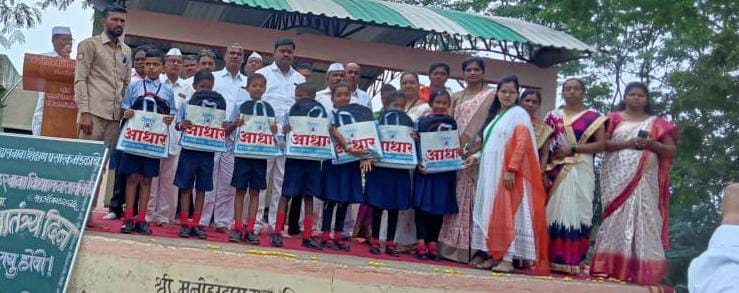 स्वातंत्र्याच्या अमृत महोत्सवोत्तर स्वातंत्र्य दिनाच्या निमित्ताने सायखिंडी येथील प्राथमिक शाळेतील आई- वडिलांचे छत्र हरवलेल्या सात मुला-मुलींना रेश्मा मनसुख/शिंदे हिने आधार संस्थेच्या माध्यमातून उत्तम दर्जाची सॅक, दप्तर,वह्या,पेन, कंपास, पाटी-पेन्सिल, रंगपेटी,आदी साहित्य देत या मुलांच्या चेहऱ्यावर आनंद फुलविला.