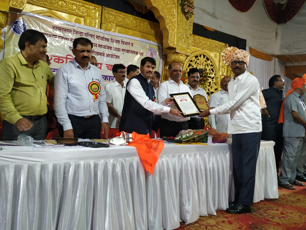 रयत शिक्षण संस्थेच्या,अश्वि इंग्लिश स्कूल व कनिष्ठ महाविद्यालय अश्वी बुद्रुक ता. संगमनेरचे प्राचार्य जनार्दन रंगनाथ बर्डे सर यांना अहमदनगर जिल्हा माध्यमिक व उच्च माध्यमिक शाळा मुख्याध्यापक संघ अहमदनगर यांच्या वतीने ज्ञानदानाचे पवित्र कार्य करत विद्यार्थ्यांना ज्ञानदानाचे नवनवीन मार्ग खुले करून देत त्यांना नवीन युगाची ओळख,क्षमतांचा विकास, तंत्रज्ञानाची ओळख विद्यार्थ्यांना करून देत विद्यार्थ्यांचा सर्वांगीण विकास साधल्याबद्दल अहमदनगर जिल्हा गुणवंत मुख्याध्यापक पुरस्कार प्रदान करण्यात आला.यावेळी शिक्षक आमदार ज्ञानेश्वर म्हात्रे सर,आमदार दराडे साहेब, शिक्षण संचालक मा.सूर्यवंशी साहेब, शिक्षण उपसंचालक मा.आहेर साहेब, जिल्हा मुख्याध्यापक संघाचे अध्यक्ष मा.पंडित सर, जिल्हा मुख्याध्यापक संघाचे उपाध्यक्ष मा.इले सर, संगमनेर तालुका मुख्याध्यापक संघाचे अध्यक्ष मा.लहारे सर आदी मान्यवर यावेळी उपस्थित होते प्राचार्य जनार्दन बर्डे सर यांचे सर्वच स्तरातूनअभिनंदन होत आहे.