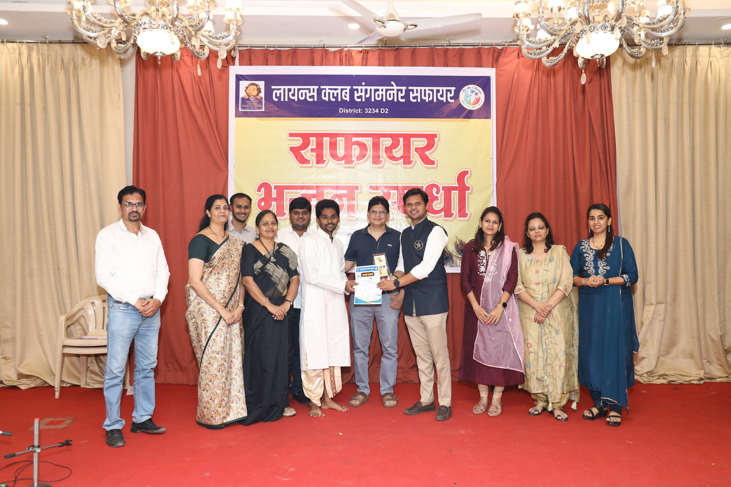 लायन्स क्लब संगमनेर सफायरतर्फे लहान मुलांच्या तीन वयोगटांसाठी भक्तीगीत गायन स्पर्धा रविवार दि. १ ऑक्टोबर २०२३ रोजी मालपाणी क्लब येथे पार पडली. वयोगट ७ ते ९, १० ते १२ व १३ ते १५ अशा चार गटांमध्ये ही स्पर्धा भरविण्यात आली होती. प्रत्येक गटातील प्रथम क्रमांकास रू. १०००, द्वितीय क्रमांकास रू. ७००, तृतीय क्रमांकास रू. ५०० तर उत्तेजनार्थ रू. ३०० आणि उत्तेजणार्थ अशी एकूण १०,००० रूपयांची रोख पारितोषिके यावेळी स्पर्धकांना देण्यात आली. ही सर्व पारितोषिके मालपाणी ग्रुप तर्फे प्रायोजित केली गेली. संस्थापक अध्यक्ष गिरीश मालपाणी, मा. अध्यक्ष श्रीनिवास भंडारी, अध्यक्ष अतुल अभंग, सचिव जितेश लोढा, खजिनदार कल्पेश मर्दा यांच्या मार्गदर्शनाखाली प्रकल्प प्रमुख प्रियंका मणियार, रितीका भंडारी, पुजा कासट यांनी या भजन स्पर्धेचे उत्कृष्ट नियोजन केले.