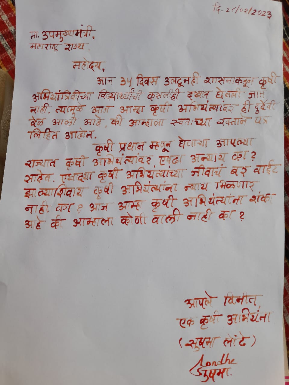 अभियंते आज स्वतः च्या रक्ताने आपल्याला पत्र देऊन विनंती करत आहे की, साहेब आता तरी थोडं लक्ष कृषि अभियंत्यांकडे द्या, आमचे म्हणणे तरी ऐकून घ्या साहेब, आमच्या सोबत चर्चा तरी करा.