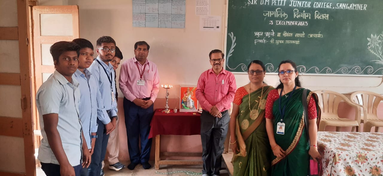 शहरातील गोखले एज्युकेशन सोसायटीचे सर डी एम पेटीट विद्यालय व कनिष्ठ महाविद्यालयात प्राचार्य सी एन निकम यांच्या मार्गदर्शनाखाली जागतिक दिव्यांग दिन साजरा करण्यात आला. या कार्यक्रमा साठी प्रमुख पाहुणे म्हणून कोल्हेवाडी येथील श्री संत जनार्दन स्वामी विद्यालय व ज्युनिअर कॉलेजचे प्राचार्य श्रीकांत माघाडे तर अध्यक्षस्थानी इन्चार्ज प्रा. गुलाब गायकवाड उपस्थित होते. कार्यक्रमाची सुरुवात ईशस्तवन व स्वागत गीताने करण्यात आली. प्रारंभी दिव्यांग विद्यार्थी व प्रमुख पाहुण्यांचे हस्ते सरस्वतीचे पूजन करण्यात आले. याप्रसंगी प्रमुख पाहुण्यांचे हस्ते सातपुते ऋषिकेश (११ कला), खताळ शिवप्रसाद (१२ विज्ञान), विजय झारेसोनार, पियुष वैराळ (११ वाणिज्य) या दिव्यांग विद्यार्थ्यांचा गुलाब पुष्प देऊन सत्कार करण्यात आला. प्रमुख पाहुणे प्राचार्य श्रीकांत माघाडे बोलताना म्हणाले की, दिव्यांग विद्यार्थी अत्यंत कष्टाळू व प्रामाणिक असतात. त्यांच्या जीवनात जे दुःख आलेले आहे ते समाजाने समजून घेऊन त्यांची हेटाळणी करू नये किंवा त्यांना दुःख देऊ नये. समाजात त्यांनाही सर्वांनी मान – प्रतिष्ठा द्यावी. दिव्यांग विद्यार्थ्यांनी खूप अभ्यास करून जीवनात मोठे व्हावे असे आवाहन केले. अध्यक्ष भाषणात प्रा. गायकवाड सर म्हणाले की, दिव्यांग व्यक्तींजवळ मूळतःच दिव्यशक्ती असते. आपल्या दिव्यशक्तीच्या जोरावर ते कठीण परिस्थितीशी सामना करत असतात. दिव्यांग व्यक्तींना सर्वांनी नेहमी मदत करून त्यांचा आदर करावा. कार्यक्रमाचे प्रास्ताविक व पाहुण्यांचा परिचय प्रा. दशरथ गभले यांनी करून दिला. कार्यक्रमाचे सूत्रसंचालन आकांक्षा जमधडे व अंजली हरनामे या विद्यार्थिनींनी केले. प्रा. रूपाली देशमुख यांनी उपस्थित सर्वांचे आभार मानले. या कार्यक्रमासाठी प्रा. परेश सांगवीकर, प्रा. स्वप्निल शिंदे, प्रा. भाऊसाहेब मांढरे, प्रा. अमोल टेमक, प्रा. सुनीता शिंदे, प्रा. सिमिका मिश्रा, प्रा. सुशीला चिमणकर, प्रा. उषा जाधव, श्रीमती मनीषा खाटेकर आदींसह सर्व विद्यार्थी उपस्थित होते.
