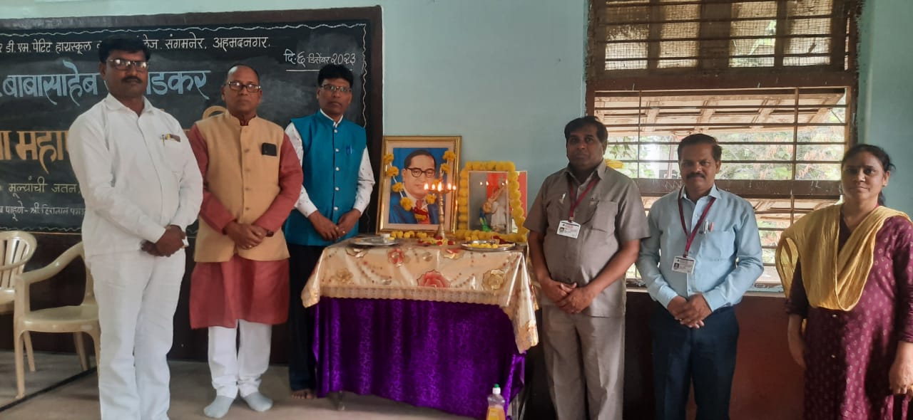 शहरातील गोखले एज्युकेशन सोसायटीचे सर डी एम पेटिट विद्यालय व कनिष्ठ महाविद्यालयात महामानव डॉ बाबासाहेब आंबेडकर यांच्या ६७ व्या महापरिनिर्वाण दिनानिमित्त त्यांना अभिवादन करण्यात आले. याप्रसंगी प्रमुख पाहुणे म्हणून टी डी एफ चे शिक्षक नेते हिरालाल पगडाल, शिक्षक पालक संघाचे माजी उपाध्यक्ष बबनराव जगताप, इन्चार्ज प्रा गुलाब गायकवाड उपस्थित होते. तर कार्यक्रमाचे अध्यक्षस्थानी प्राचार्य सी. एन निकम होते . प्रारंभी प्रमुख मान्यवरांच्या हस्ते महामानव डॉ. बाबासाहेब आंबेडकर यांच्या प्रतिमेला पुष्पहार घालून अभिवादन करण्यात आले. हिरालाल पगडाल बोलताना म्हणाले की, डॉ. आंबेडकरांनी दलितांशिवाय सर्वच जनतेसाठी काम केले आहे. शिका संघटित व्हा व संघर्ष करा हा मंत्र त्यांनी जनतेला दिला. अध्यक्ष भाषणात प्राचार्य निकम म्हणाले की, शिक्षणातूनच सर्वांचा विकास होतो. यासाठी सर्वांनी चांगले शिक्षण घ्यावे. पाहुण्यांचा परिचय इन्चार्ज प्रा. गुलाब गायकवाड, प्रास्ताविक प्रा. दशरथ गभाले, सूत्रसंचालन गायत्री गवांदे, धनश्री वाघमारे यांनी केले तर उपस्थित सर्वांचे आभार प्रा. रूपाली देशमुख यांनी मानले. या कार्यक्रमासाठी प्रा परेश सांगवीकर, प्रा स्वप्निल शिंदे, प्रा भाऊसाहेब मांढरे, प्रा अमोल टेमक, प्रा सुनिता शिंदे, प्रा सुशीला चिमणकर, प्रा सिमिका मिश्रा, प्रा उषा जाधव श्री संतोष धुळे, ग्रंथपाल सांगळे के के, श्रीमती मनीषा खाटेकर आदींसह सर्व शिक्षक, शिक्षकेतर कर्मचारी व विद्यार्थी उपस्थित होते.