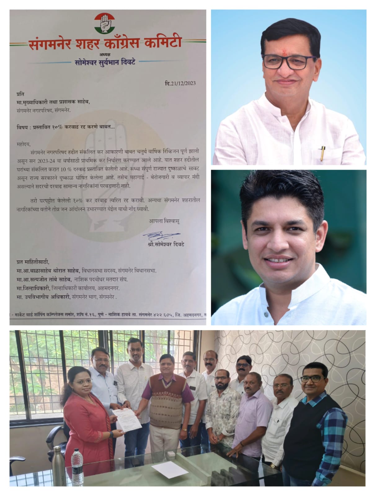 नगरपरिषद प्रशासनाकडून घरपट्टी मध्ये दहा टक्के दरवाढ प्रस्तावित केल्यानंतर लगेचच ही अन्यायकारक दरवाढ रद्द करावी याकरता माजी आमदार डॉ सुधीर तांबे व नगराध्यक्ष सौ दुर्गाताई तांबे यांनीही सातत्याने पाठपुरावा केला असून शहर काँग्रेसच्या वतीने याबाबत निवेदनही देण्यात आले .याप्रसंगी माजी नगराध्यक्ष दिलीपराव पुंड ,किशोर पवार, गजेंद्र अभंग, शहराध्यक्ष सोमेश्वर दिवटे ,संतोष कोळपकर, प्रवीण वरपे,रवींद्र ताजने ,बाळासाहेब पवार ,राजेंद्र निराळी ,अरुण हिरे, ज्ञानेश्वर नाईक ,सतीश मणियार, शैलेश कलंत्री, नूर मोहम्मद शेख आदींसह विविध पदाधिकारी उपस्थित होते.