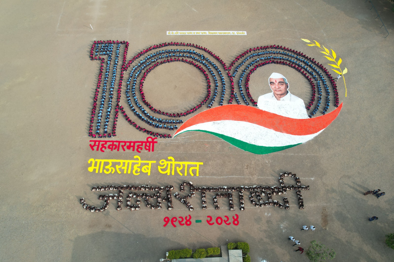 वडगाव पान येथील डि.के. मोरे जनता माध्यमिक व उच्च माध्यमिक विद्यालयाच्या मैदानावर या शाळेतील 1385 विद्यार्थ्यांनी क्रीडा शिक्षक बाळासाहेब कांडेकर व कलाशिक्षक सत्यानंद कसाब यांच्या संकल्पनेतून ही जन्मशताब्दीची प्रतिकृती साकारली. थोर स्वातंत्र्य सेनानी भाऊसाहेब थोरात यांचे हे जन्मशताब्दी वर्ष असून यानिमित्त तालुक्यात विविध उपक्रमांचे आयोजन केले आहे. सह्याद्री विद्यालयाने सांस्कृतिक कार्यक्रमांमधून सहभाग नोंदवत विद्यार्थ्यांच्या कलागुणांना वाव दिला आहे. याच उपक्रमांतर्गत जनता विद्यालयात इयत्ता पाचवी ते बारावी मधील 1385 विद्यार्थ्यांनी मैदानावर अनोखी बैठक करून संस्थेचे संस्थापक सहकार महर्षी भाऊसाहेब थोरात यांच्या जन्मशताब्दी निमित्त 100 हा मानवी प्रतिकृतीचा अभिनव लोगो साकारला आहे. यामध्ये एक सूर एक ताल करत विद्यार्थ्यांनी विविध कला व क्रीडा उपक्रम सादर केले. अभिनव रांगोळी पाहण्याकरता पंचक्रोशीतून अनेक विद्यार्थी व पालकांनी मोठी गर्दी केली होती.