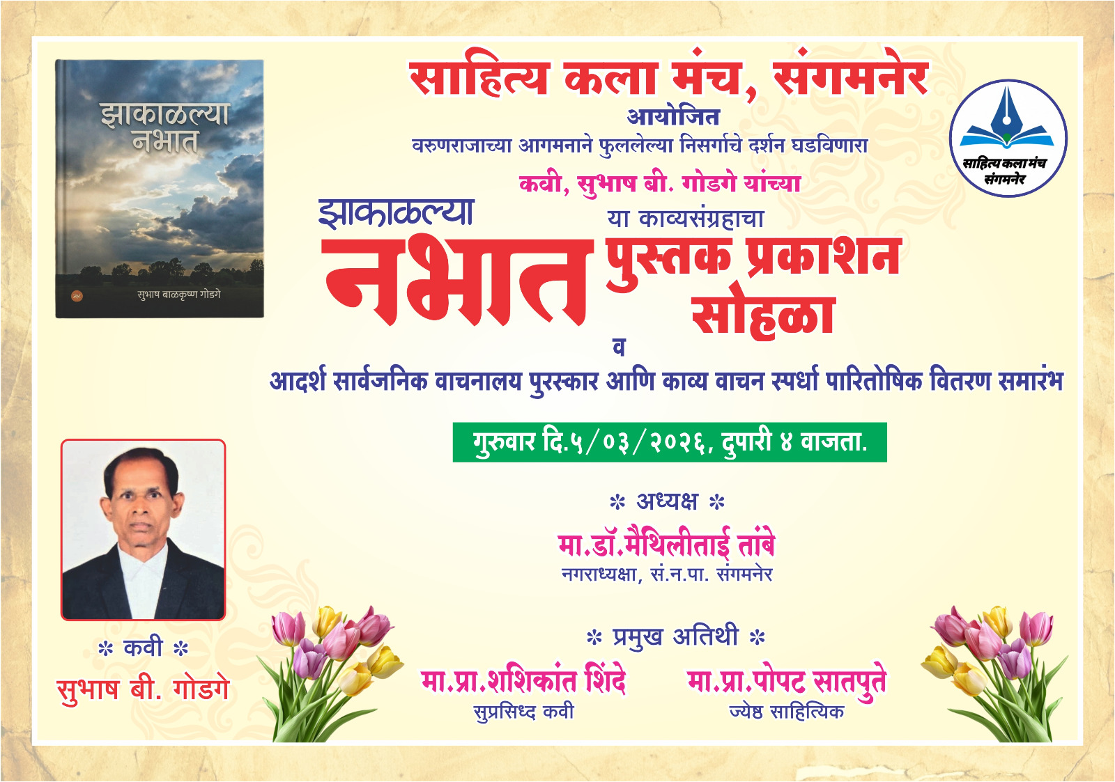 साहित्यप्रेमींसाठी आनंदाची पर्वणी ठरणारा ॲड. सुभाष गोडगे यांच्या ‘झाकाळल्या नभात’ या काव्यसंग्रहाचा प्रकाशन सोहळा गुरुवार दिनांक ५ मार्च २०२६ रोजी दुपारी ४ ते ६ या वेळेत संगमनेर येथील व्यापारी असोसिएशन हॉल येथे संपन्न होणार आहे. या कार्यक्रमाचे आयोजन साहित्य कला मंच यांच्या वतीने करण्यात आले आहे.