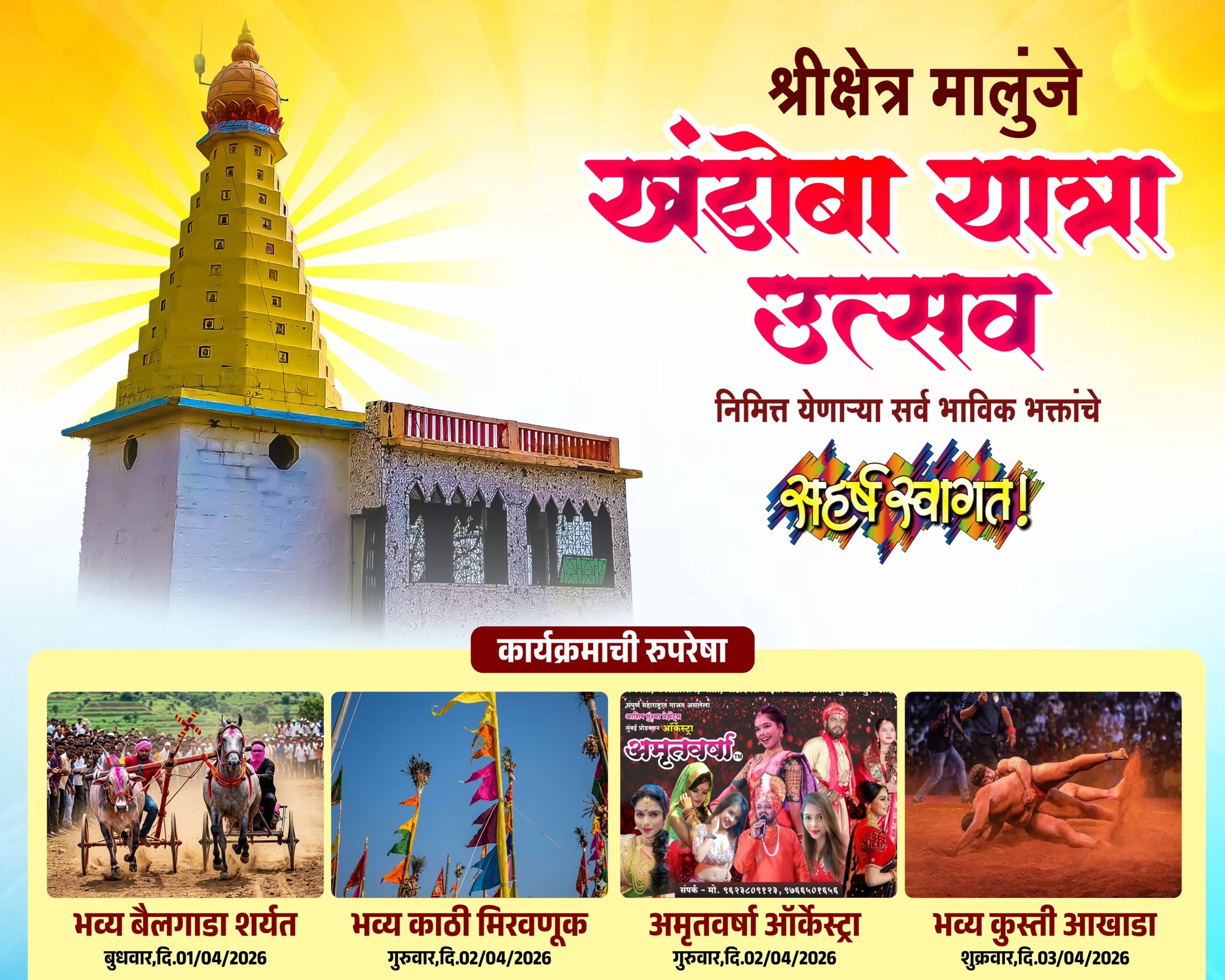 उत्सवातील प्रमुख आकर्षण भव्य बैलगाडा शर्यत बुधवार दि. 01/04/2026 रोजी पार पडणार असून या शर्यतीसाठी परिसरातील शेकडो स्पर्धक तयारीत आहेत. त्यानंतर गुरुवार दि. 02/04/2026 रोजी भव्य काठी मिरवणूक भव्य दिमाखात काढण्यात येणार आहे. याच दिवशी रात्री लोकप्रिय अमृतवर्षा ऑर्केस्ट्रा कार्यक्रमाचे आयोजन करण्यात आले आहे. सांस्कृतिक रंगत आणणारा हा कार्यक्रम तरुणाईसह सर्वांच्याच उत्साहात भर घालणार आहे.