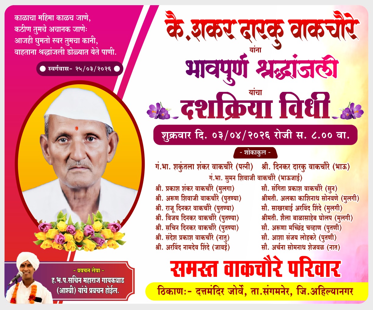 “शिस्त, स्वाभिमान आणि प्रेमाची परंपरा जपणारे गावचे आधारस्तंभ… शंकरराव वाकचौरे यांना भावपूर्ण श्रद्धांजली”