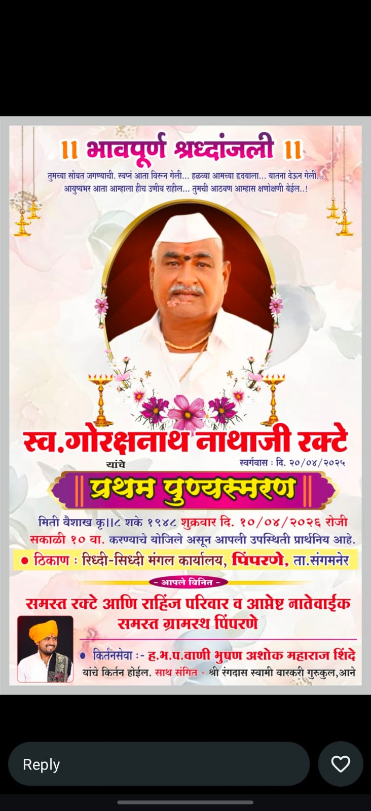 पिंपरणे गावातील गोरक्षनाथ नाथाजी रक्टे हे कष्ट, प्रामाणिकपणा आणि साधेपणाचे मूर्त रूप म्हणून सर्वांच्या मनात घर करून गेलेले व्यक्तिमत्त्व. त्यांचे पहिले पुण्यस्मरण साजरे होत असताना गावकऱ्यांच्या आठवणींमध्ये त्यांचे कार्य, त्यांची माणुसकी आणि त्यांची जीवनशैली पुन्हा एकदा जिवंत होत आहे.